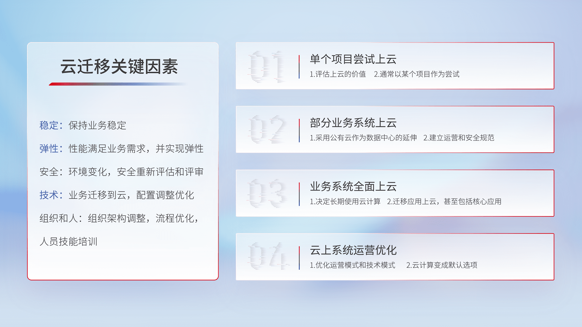 结合实际业务,,,从规划设计、、云平台选型、、、云原生改造、、数据迁移、、、集成交付,,迁移全过程为客户识别最佳上云路径,,,做好风险识别管理,,,,设计网络架构、、、、身份权限、、安全审计合规、、、、操作审计、、日志审计、、监控告警策略、、多站点容灾设计等,,对云上基础设施进行整体规划,,,,提升IT治理水平,,以满足弹性、、高可用、、、、高性能的需求。。。