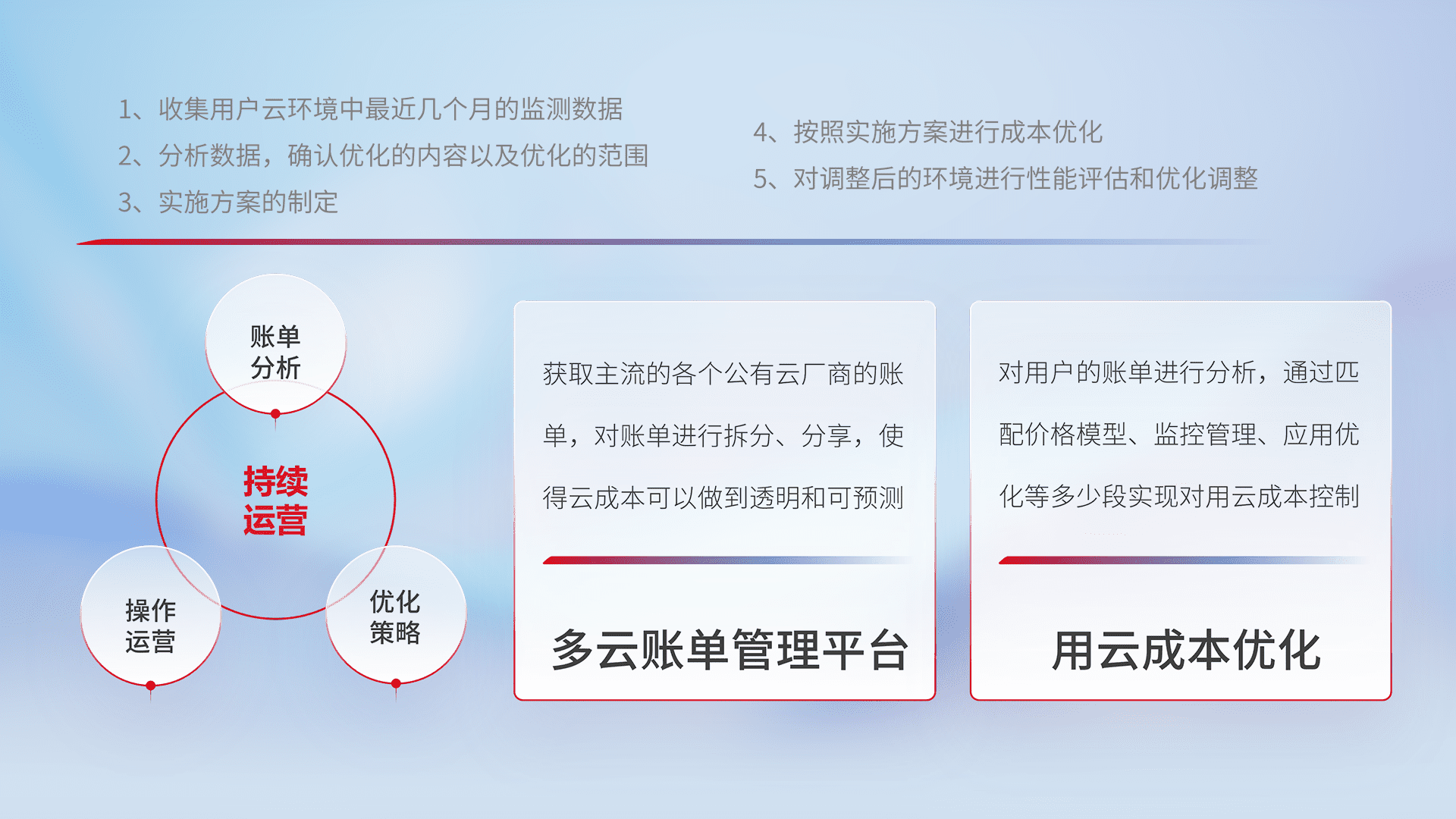 通过多云纳管,,,,以统一的资源数据模型把客户的云资源进行抽象和封装,,,,进而实现对多云资源的统一操作,,,,保障云资源管理的可靠性、、、稳定性与可用性。。。量身定制化运维内容,,配置、、、开发运维、、、补丁管理、、、、备份、、监控、、认证和访问管理、、、审计和日常巡检等,,,,保障在用云过程中的可靠度,,,稳定度以及高可用率。。。。